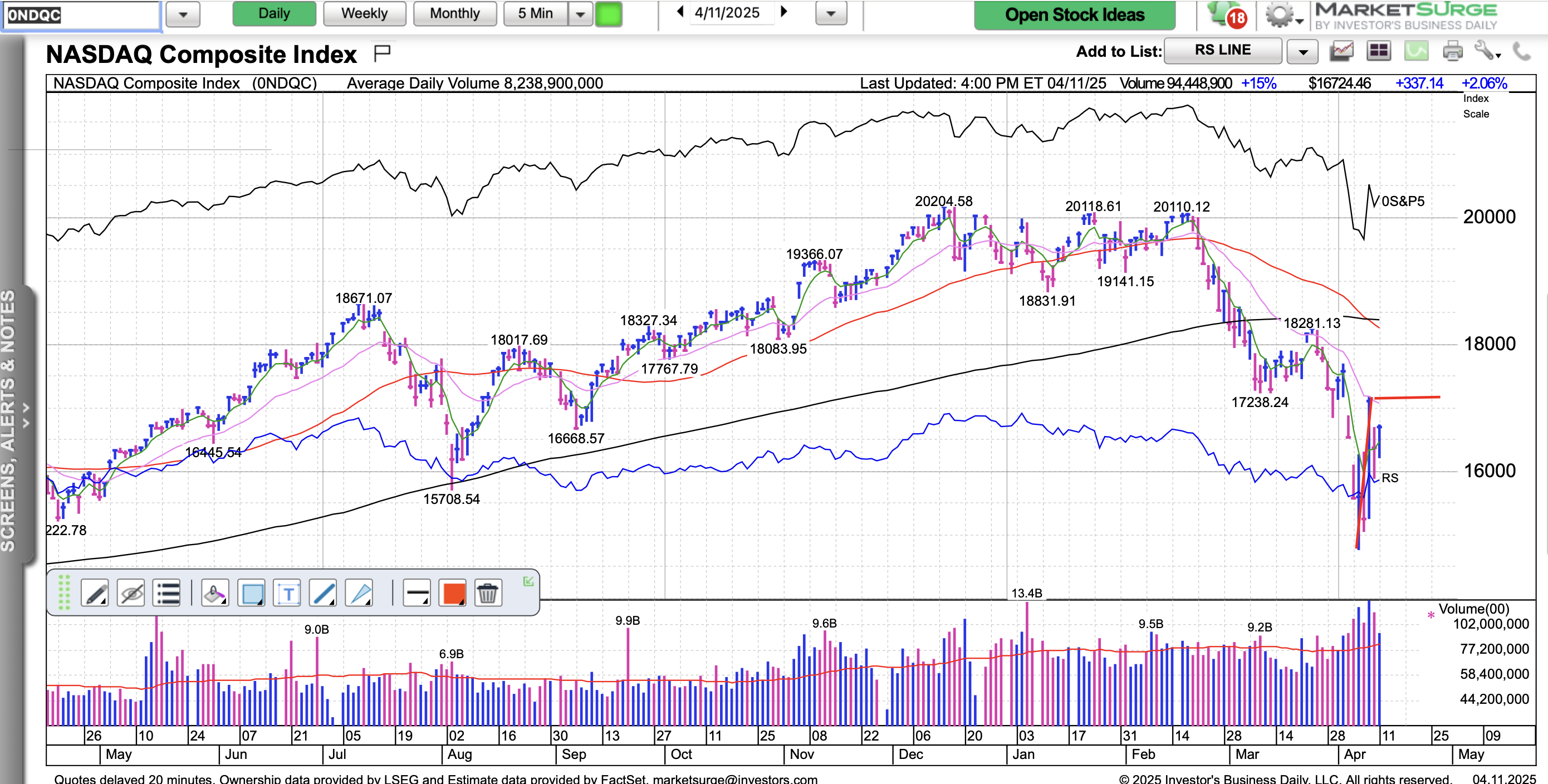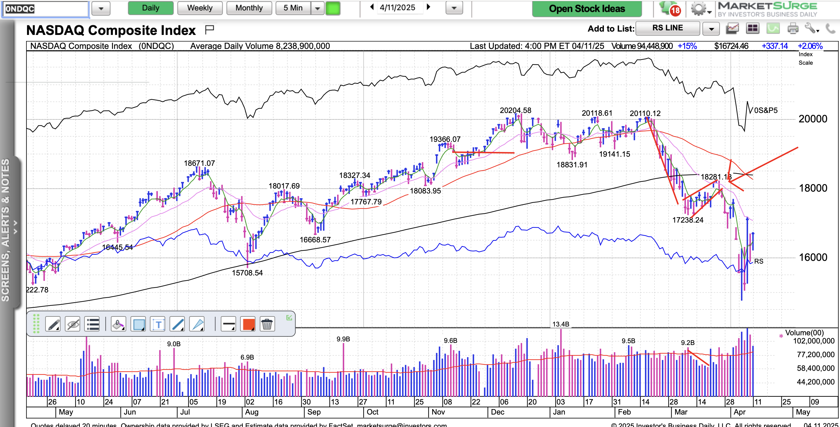 The recent move from the low on April 7 of 14,784 to the high of 17,202 is 16% in just three sessions. That move was accompanied with massive volume. That is not our typical bear wedge action. This looks like a washout at the lows and there are no more sellers. The buyers stepped up in a big way. The Nasdaq now needs to trade above that 17,202 high from Wednesday April 9. It has some work to do still.