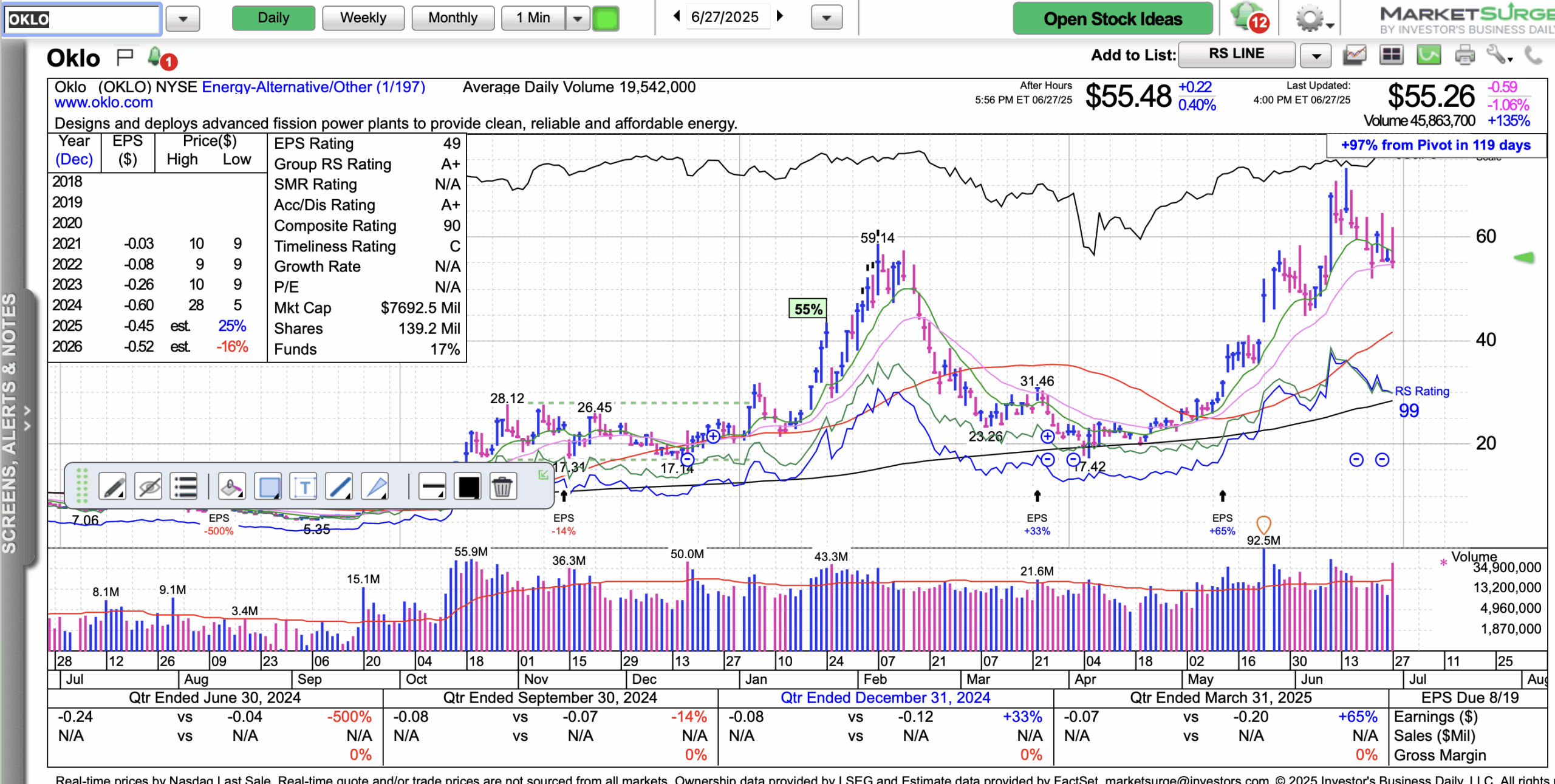 OKLO is not extended at all . In fact, it has pulled back to its 21ema and below  an old buy point of $59.14. It is forming a bull wedge pattern, and likely to bounce off its 21ema.