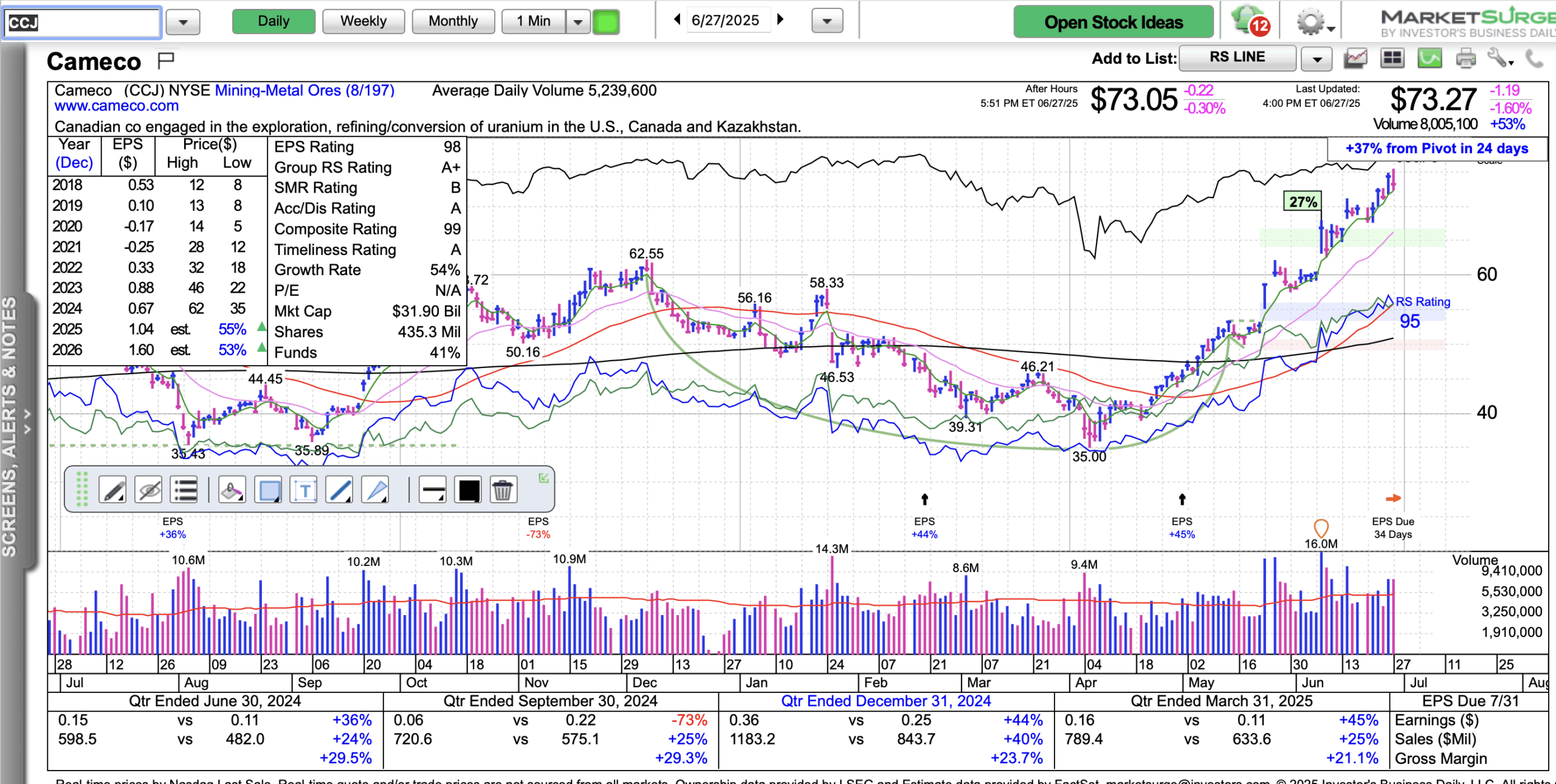 In regards to the three stocks you mention, CCJ would be considered "chasing" as it closed on Friday 1.4% above its 5ema. It may be bought on Monday if it starts to bounce as it continues to find support t at its 5ema.
