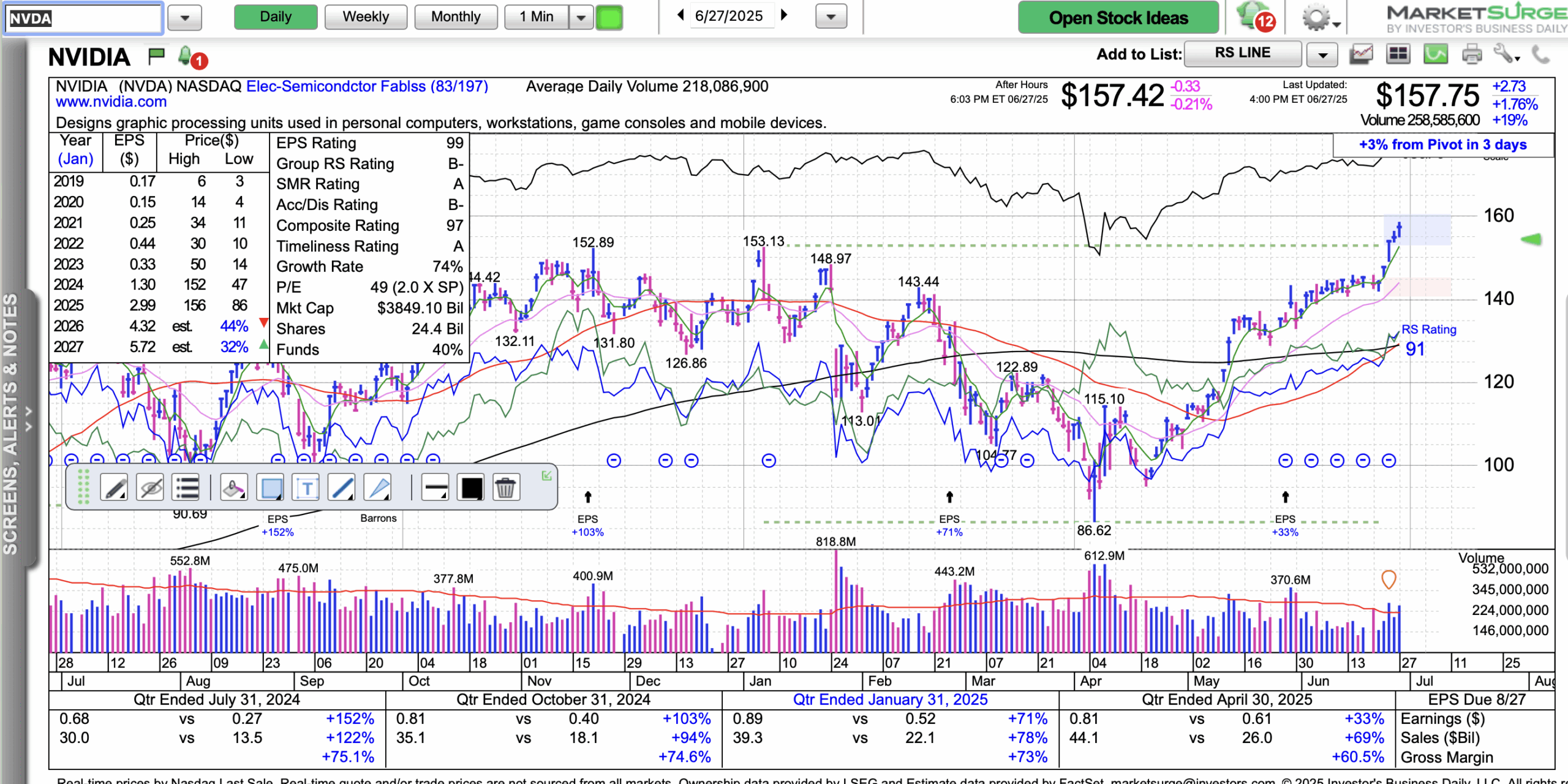 NVDA This is the most extended stock of the three you mentioned as it closed on Friday 3.1% above its 5ema. It has a standard buy point at $153.13 and I would consider it "chasing" to be buying at $157.75. Let it come back to your entry level.