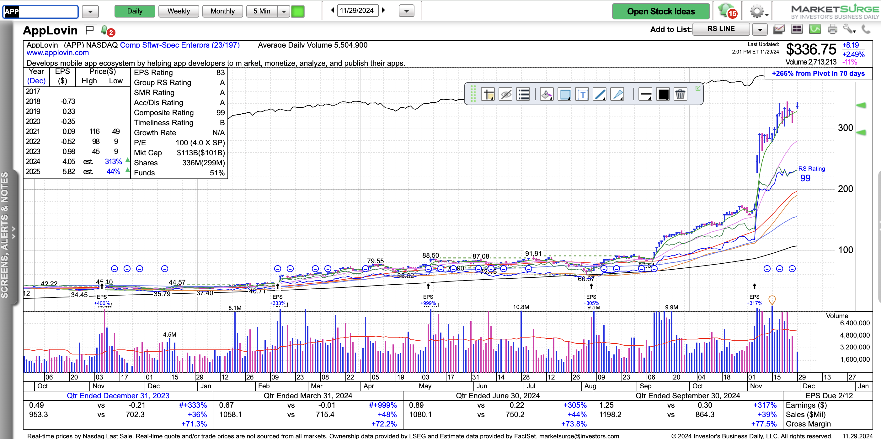 The market conditions will dictate how much leeway I will give a stock. There are rule where we sell when a stock is 100% above its 200sma. However, you would los big profits on a sticklike APP which has traded 100% above its 200sma since November 7. If you sold using that rule at $250 then you missed on a $90 move. This current uptrend is strong and we need to maximize profits.