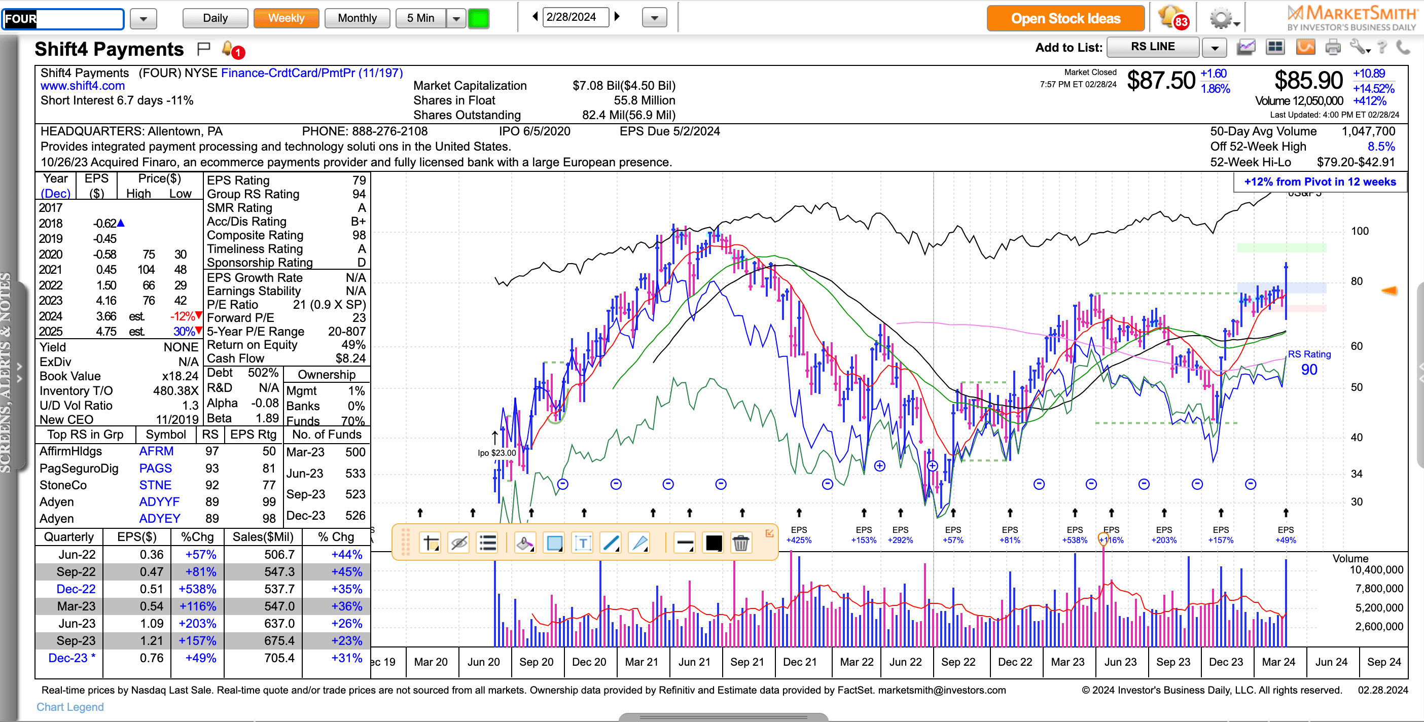 FOUR has been consolidating in a stage two base for 36 weeks with the $76.40 buy point. It advanced higher today due to the reports of overtures from more than one suitor. I am not sure if FOUR is interested in a. buyout. But, that would put a floor under that stock in the short term. The weekly chart looks great! Congratulations!