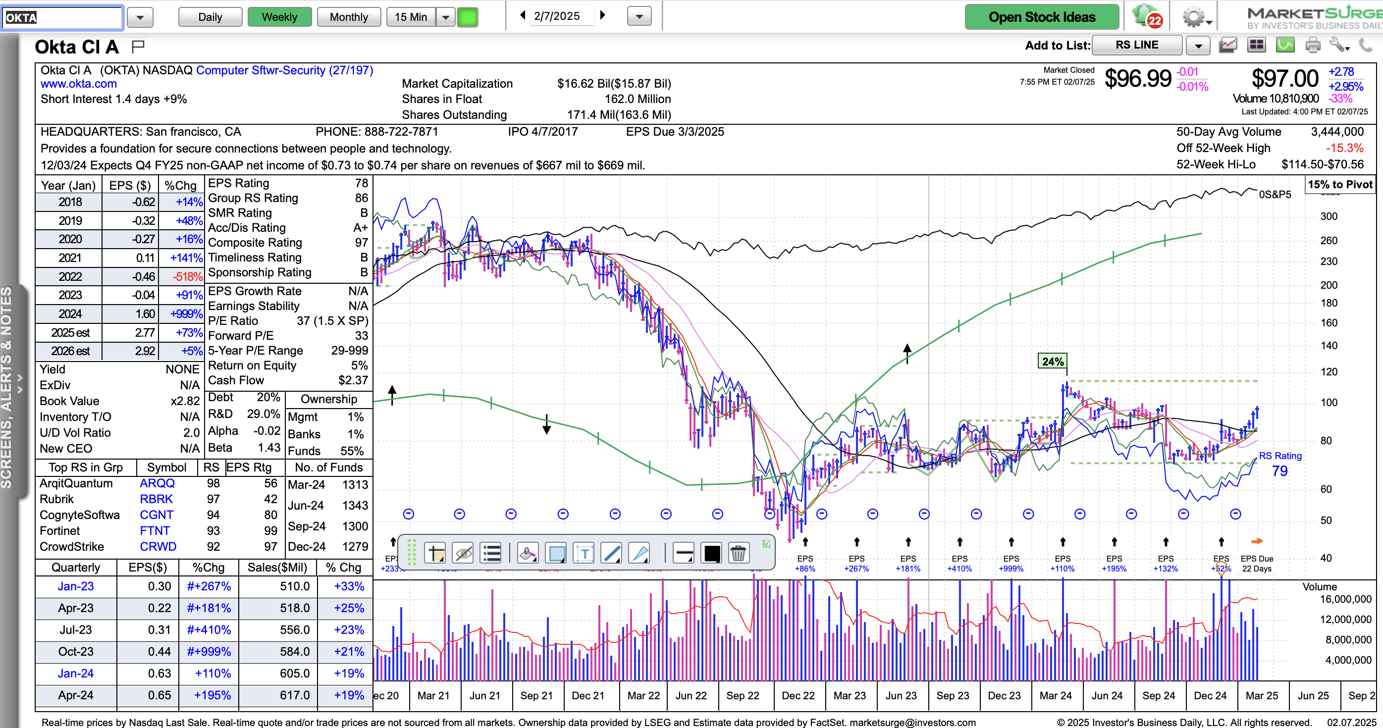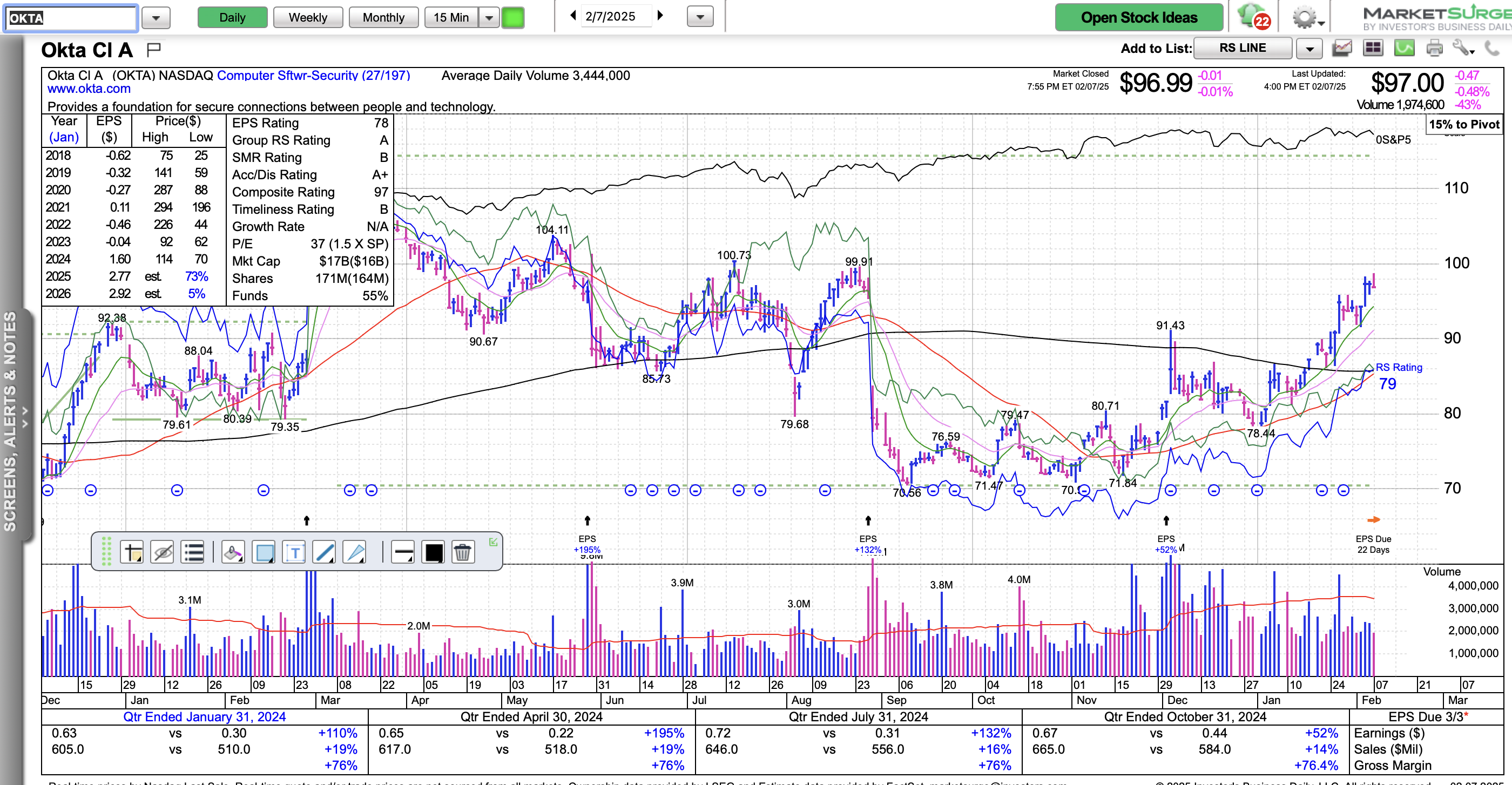 OKTA looks fantastic! It is in a top 30 industry group and the group is climbing. The daily chart shows an early entry buy point at $99.91.