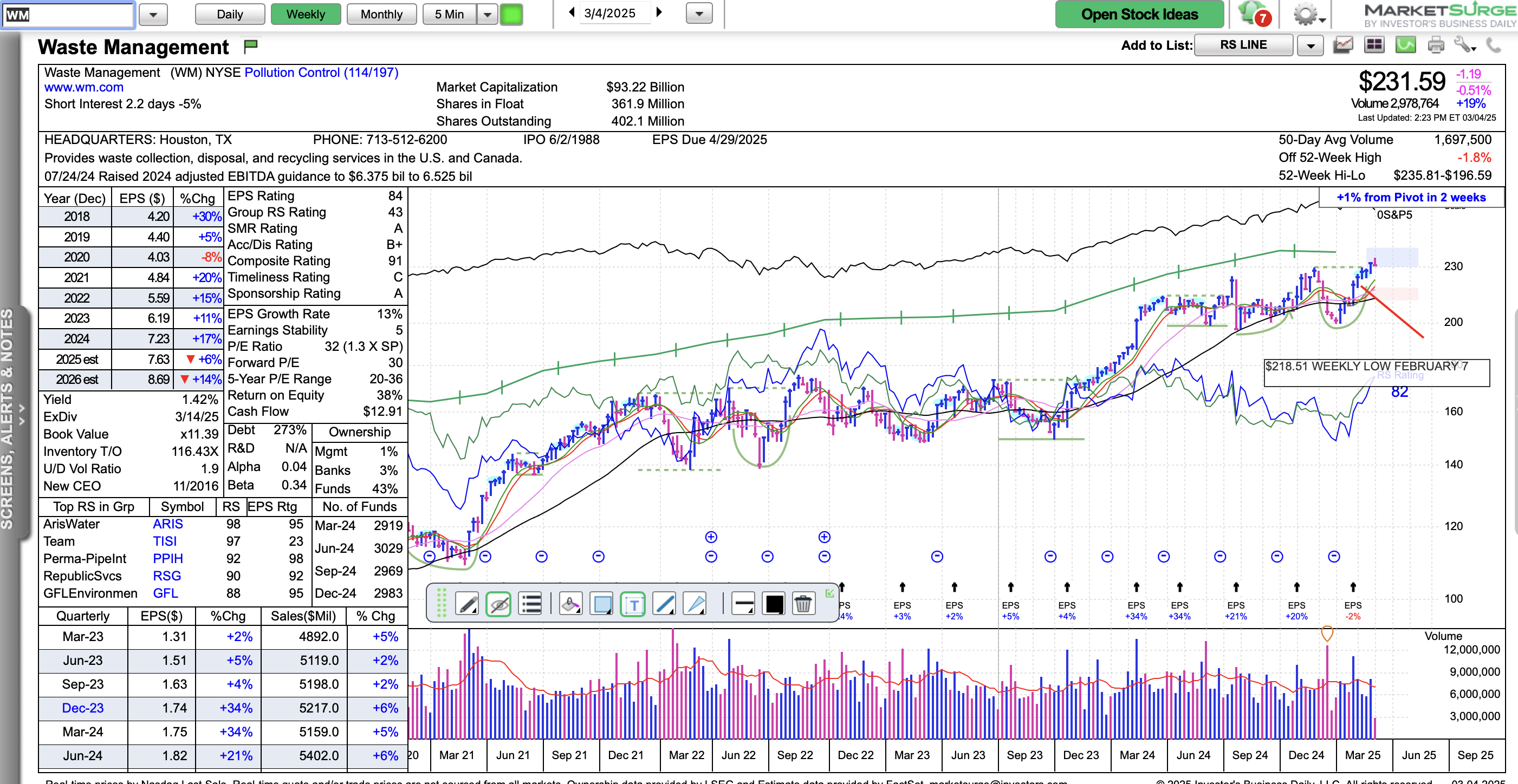 I am not sure of your entry price on WM. That is a good stock for this type of environment as it is a "defensive" stock. I would not allow WM to trade below $218.51 as that is the low from the week of February 7. That is also 5% below the $230.00 level. I would start taking some profits (33% or more) at a 5% gain. This market is not allowing for much appreciation. If you bought at $230 then taking partial profit at $240 makes sense while the market is so weak.