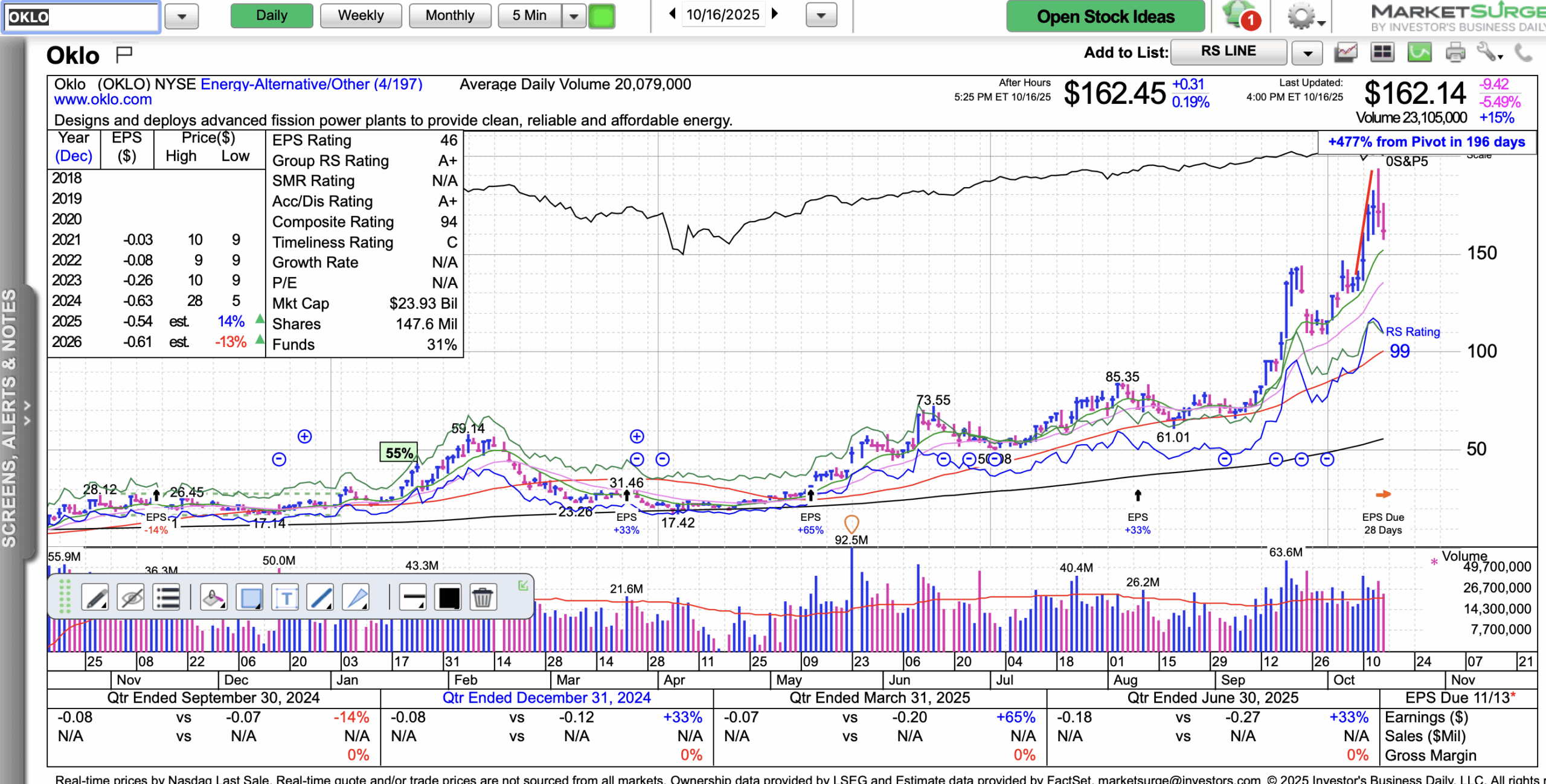 I do not have much pain tolerance and when a stock reverses like OKLO did on Wednesday my expectation is that it will follow through to the downside and seek support. We have no idea where or when a stock will find support and that is why I like to sell those reversal. Some people want to hold longer term and believe OKLO is going much higher and will hold through the downturns. I am not wired that way, and respect those who have the ability to sit through downturns. OKLO is a powerful stock and will resume its uptrend and I will likely buy it back.