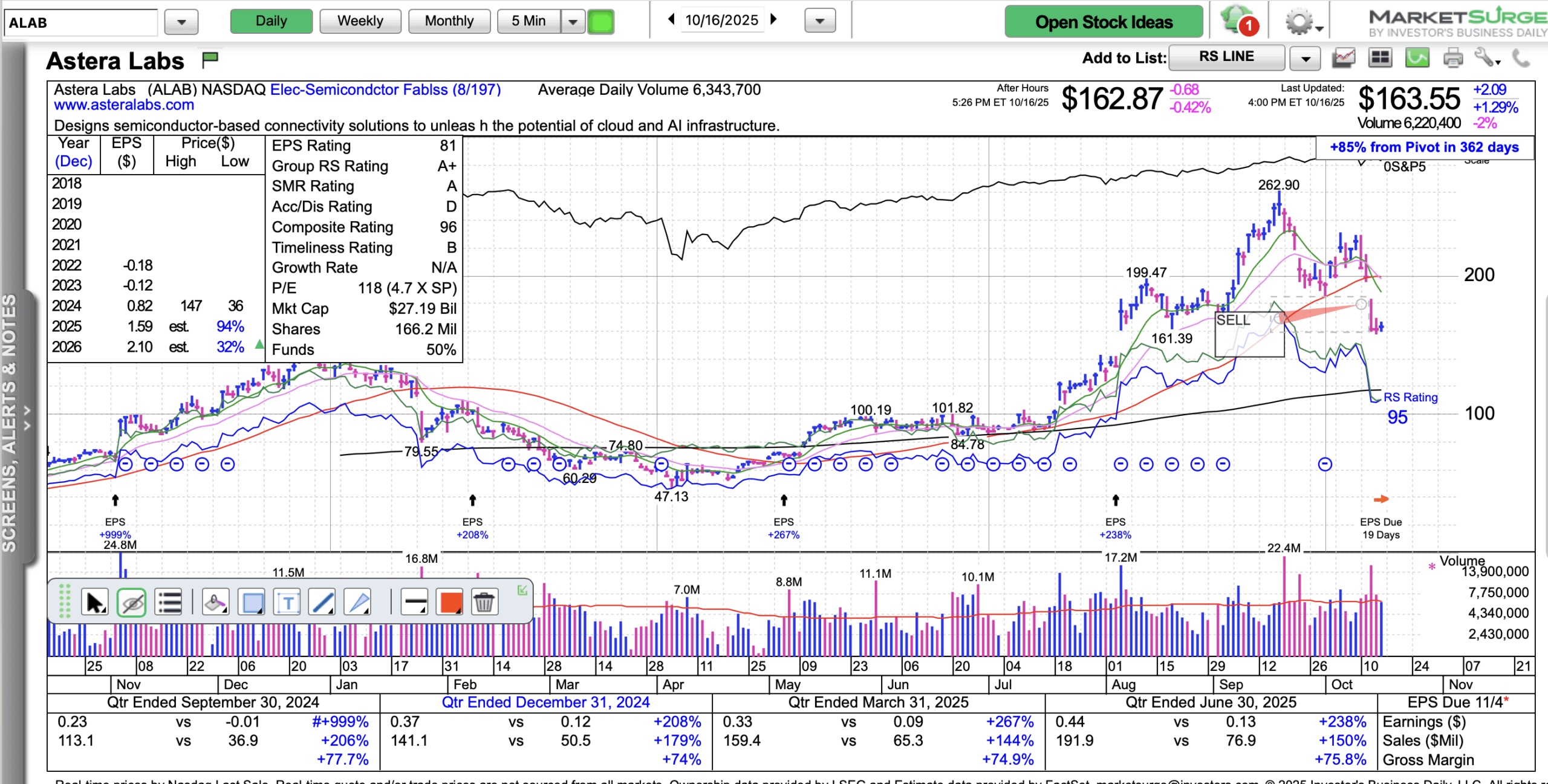 ALAB sliced its 50sma with volume and that is an automatic set for me. I have learned over the years when a growth stock slices its 50 small with volume as Astera Labs did it is a set signal. It will normally take some time for it to stabilize and trade back through that level.